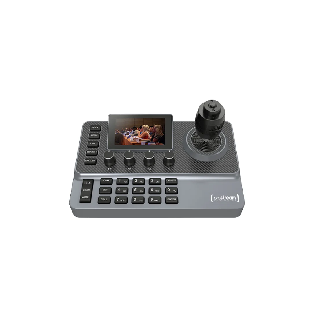 Controle de câmeras PTZ com joystick 4D, tela LCD, botões personalizáveis e suporte a múltiplos protocolos. Ideal para ambientes profissionais de gravação.