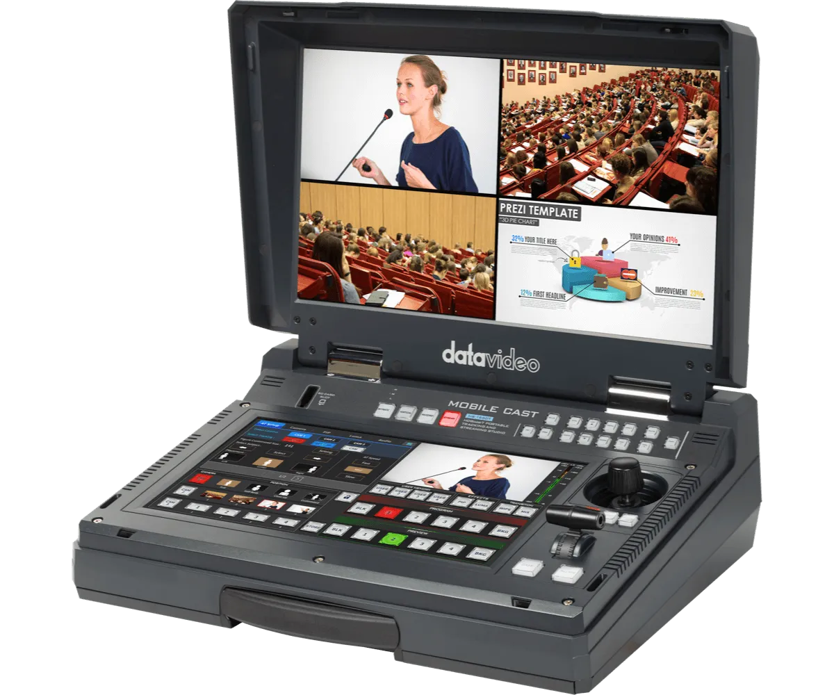 O Datavideo HS-1650T é um estúdio de produção HDBaseT compacto de 4 canais, projetado para eventos ao vivo, educação e conferências. Ele combina comutação de vídeo, streaming, gravação, controle de câmera e mixagem de áudio em uma única unidade portátil.