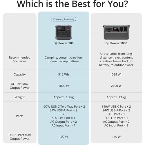 A Power 500 possui uma bateria LFP de 512 Wh com saída máxima de 1000 W.