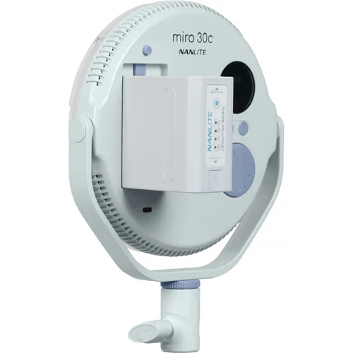 Painel de LED redondo RGB Miro 30c, da Nanlite, é uma fonte de luz elegante e circular que oferece versatilidade em cores, controle e alimentação. Compacto, com aproximadamente 18 cm e pesando menos de meio quilo, o Miro 30c é altamente portátil e fácil de manusear, capaz de criar qualquer cor graças ao seu processador Nebula C4. Um benefício adicional do Miro 30c é seu formato redondo, complementado por um difusor magnético que proporciona luz suave. As opções de alimentação incluem energia CA, baterias NP-F (opcionais) ou power banks USB-C. A Nanlite também fornece cabo USB-C, receptor 5/8″ com rosca 1/4″-20 para tripé e bolsa de transporte. Esta versão possui acabamento azul menta, ideal para podcasts, transmissões ao vivo e qualquer outra criação de conteúdo.