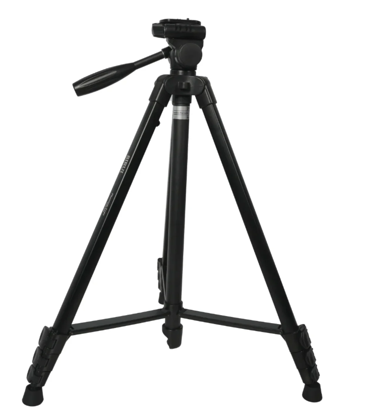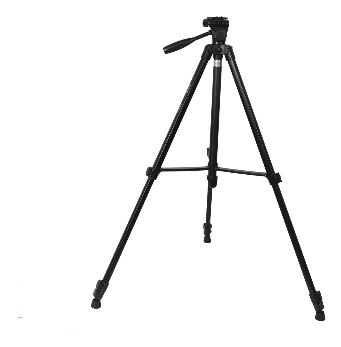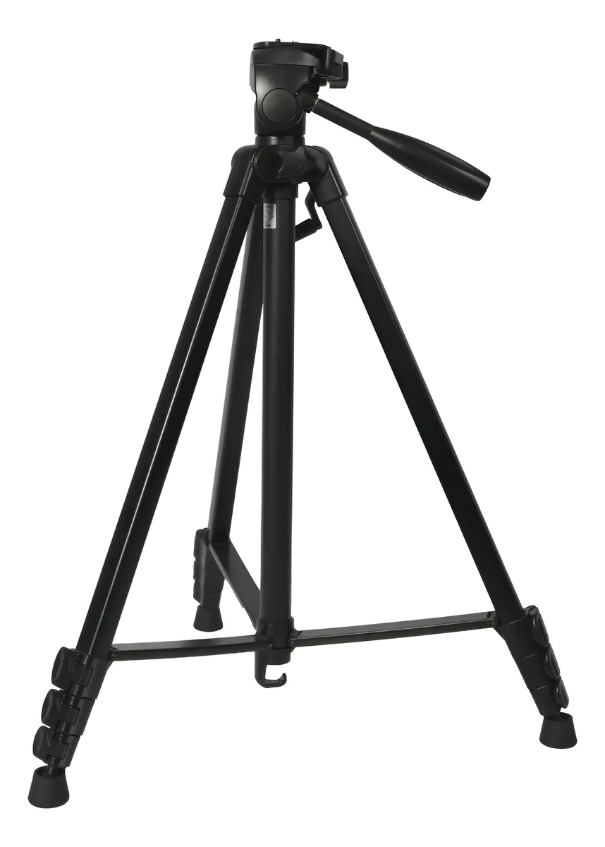 Tripé fotográfico leve e ajustável, ideal para câmeras, filmadoras, smartphones e dispositivos multimídia. Construção em alumínio com cabeça integrada de movimento panorâmico e inclinação precisos. Altura ajustável para uso em vídeos, fotografia, transmissões ao vivo e eventos.